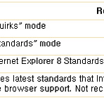 아래와같이 메타태그로 선언해주면. 해당 페이지는 그 IE 버전으로만 돌아간다. 나름 사용하기에 따라 유용하게 사용 할 수 있을듯? Content goes here. IE 8이 기본적으로 아래 표와 같이 이전 버전을 지원할 수 있도록 Multi engine을 탑재하고 있다. 따라서 IE7에 최적화된 사이트로 문제없이 IE8을 이용해서 볼 수 있으며, 웹 사이트를 서비스하는 업체에서도 간단한 방법으로 IE8에 대응할 수 있다. 위 표에서 호환성 모드 값은 웹사이트 개발자가 해당 웹페이지를 특정 버전으로 보이게 하고 싶을 때 태그를 추가하거나 혹은 IIS에서 X-UA-Compatible: IE=7을 헤더값에 추가하는 방식으로 사용하게 된다. 원본 : http://msdn.microsoft.com/un-us/l..